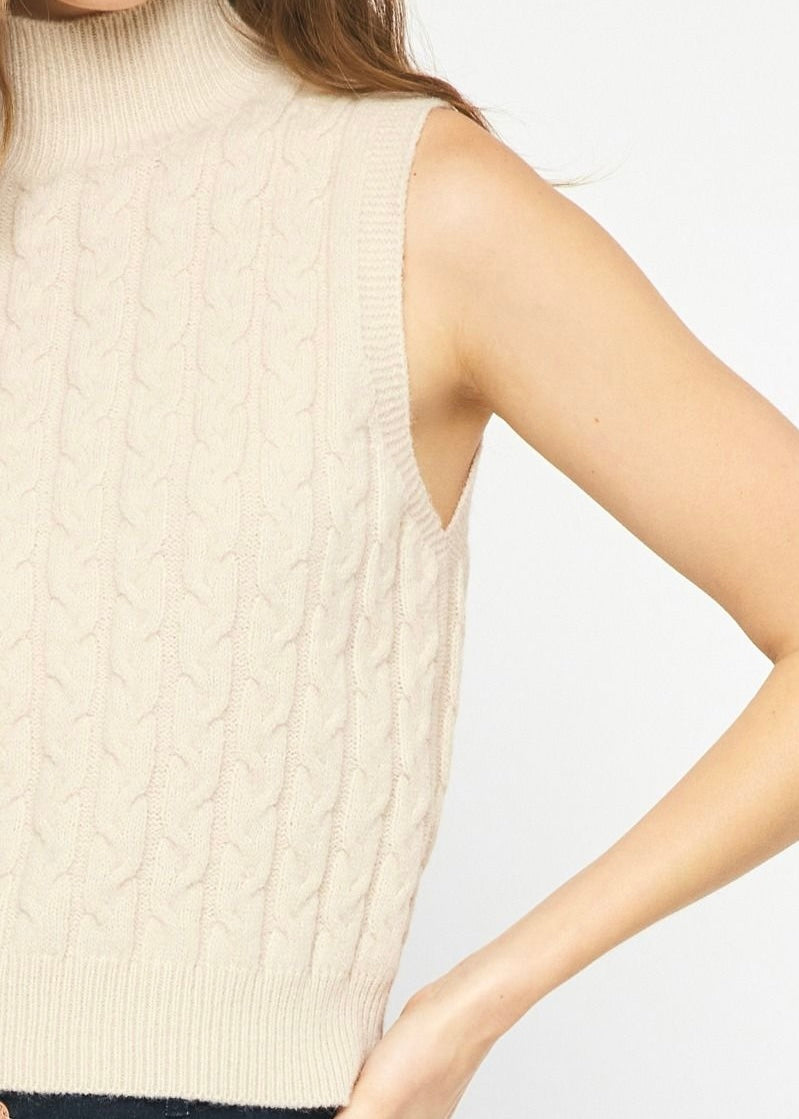 Cableknit turtleneck sleeveless sweater vest featuring ribbed hem.