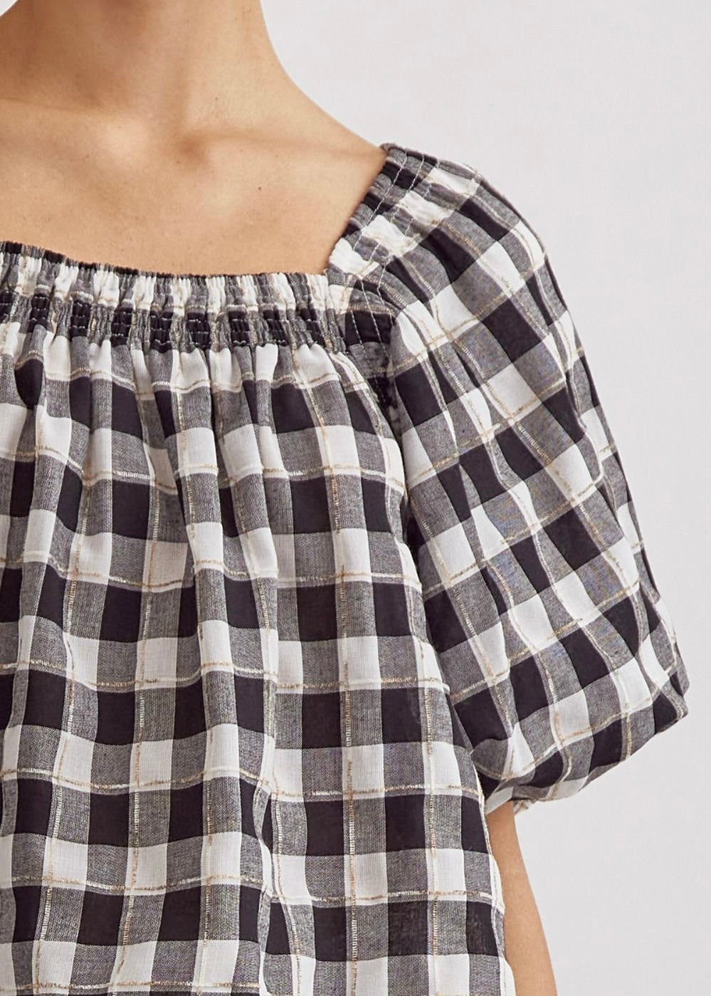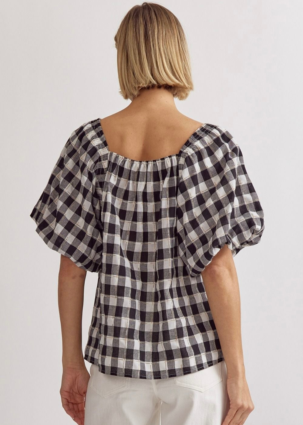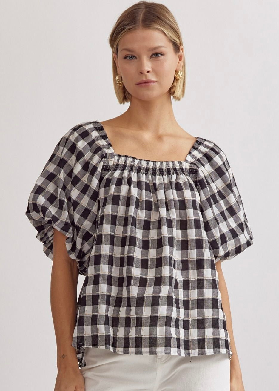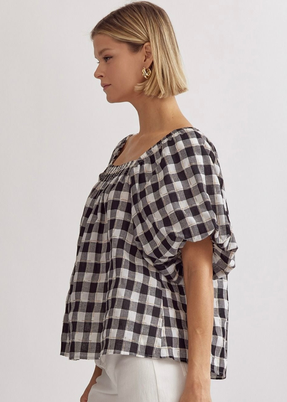 Black and white gingham top with square neck and puff sleeves. Perfect for game day!