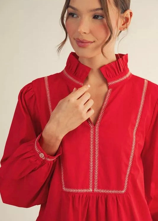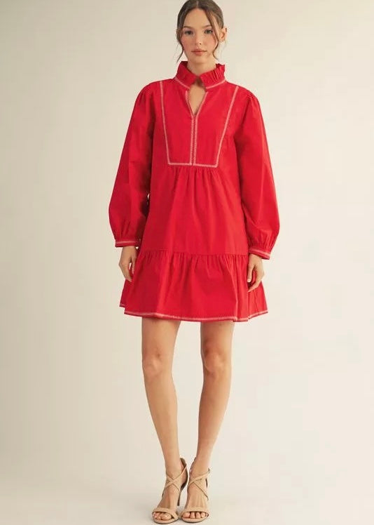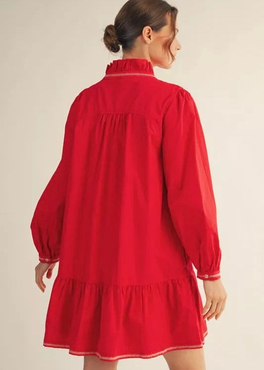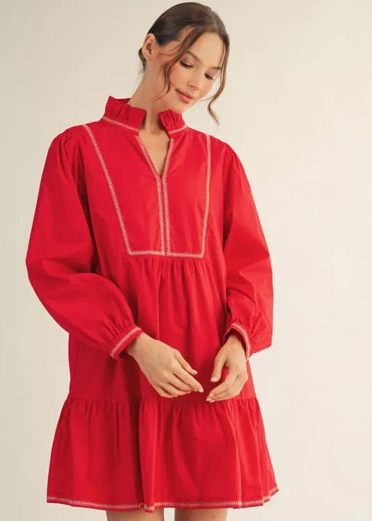 Red long sleeve dress with ruffle neckline, white stitch detail, and side pockets.