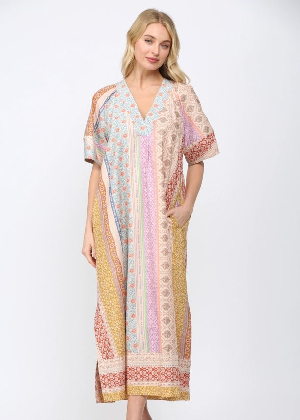 Patchwork print deep v-neckline kaftan style dress.