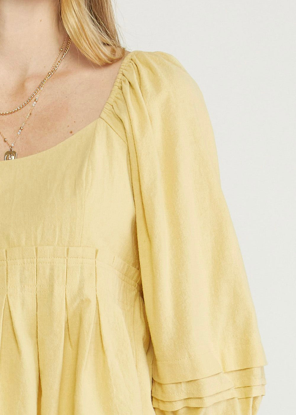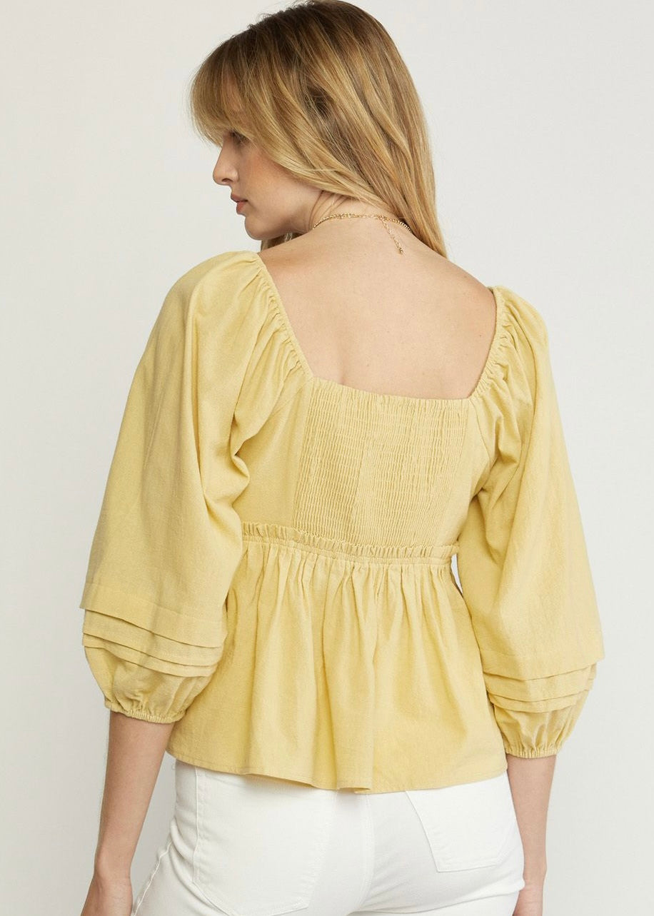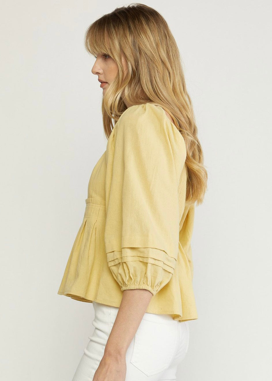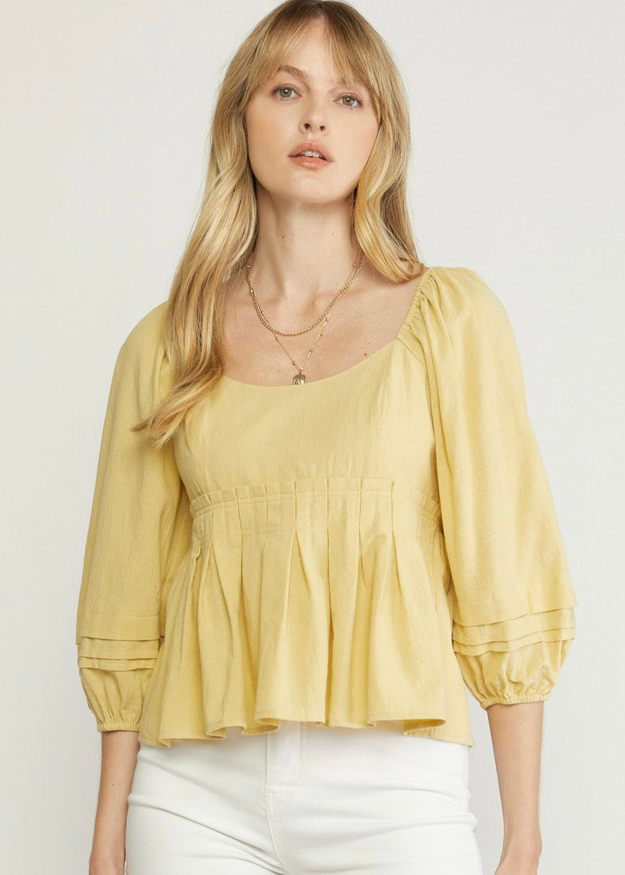 This soft yellow buttery top is the perfect spring color. The cutest peplum fit with pinned pleat detail. If busty, we recommend sizing up!