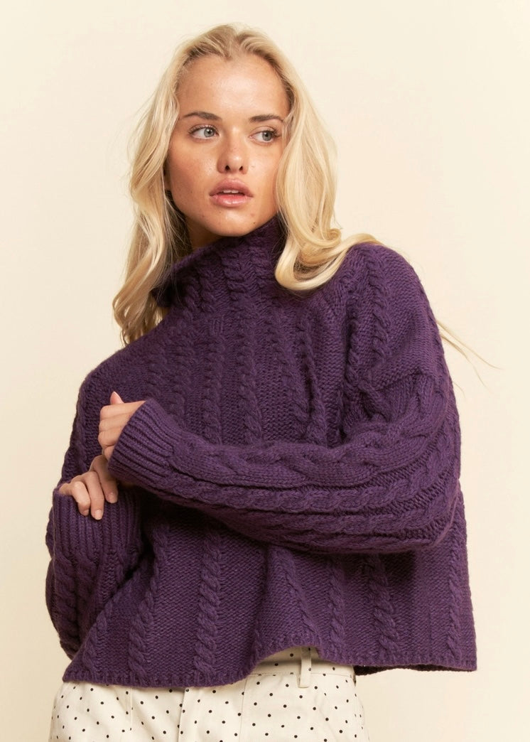 Dark purple cable knit swing sweater. Hits at hip.