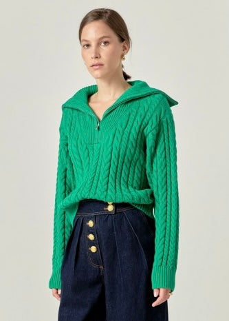 Kelly Green cable knit pullover half zip sweater. Silver zipper.