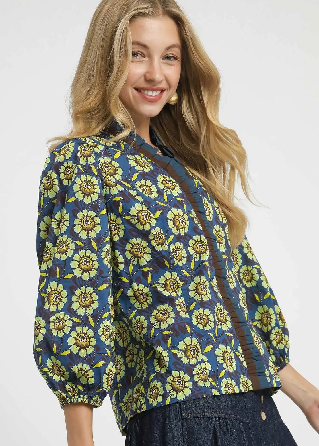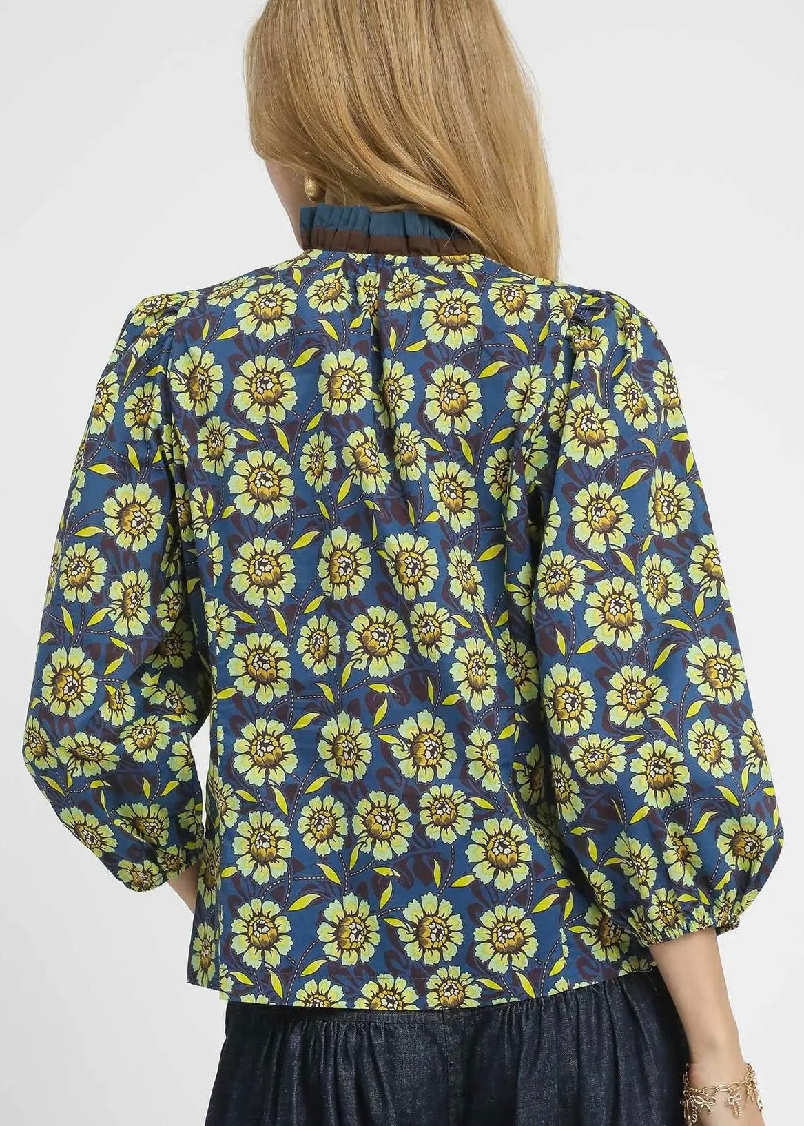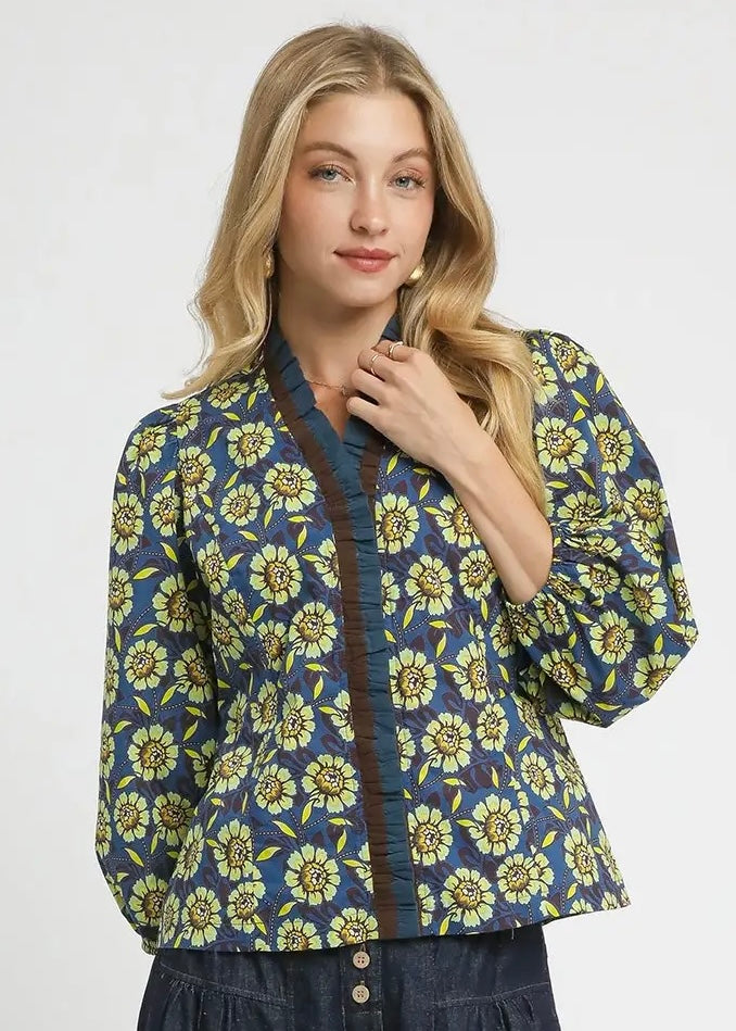 Navy, brown, and chartreuse floral cotton top.